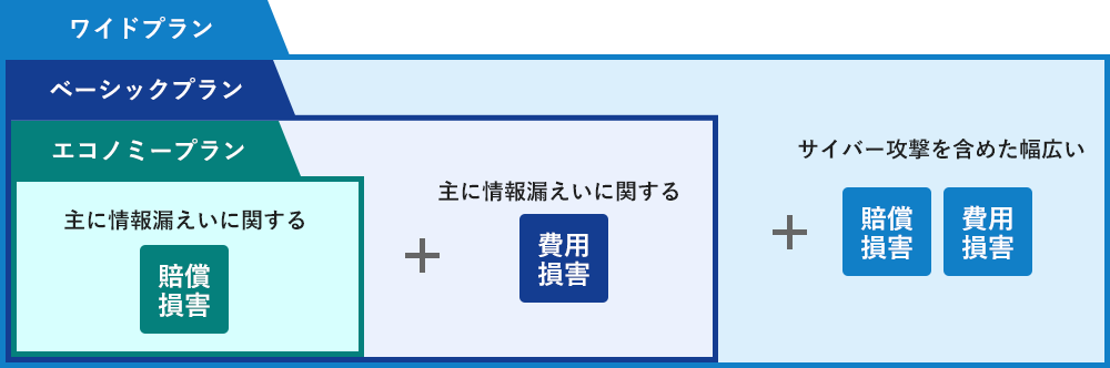 - 情報漏えいに関わる「賠償損害」「費用損害」を補償するプランです。