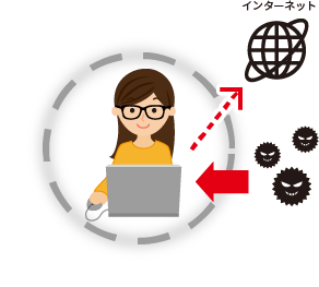 社内ネットワーク下で安全な端末を使用した状況に比較して、適切なセキュリティ対策がなされていない場合は、ウイ ルス感染などのサイバーリスクが増大します。